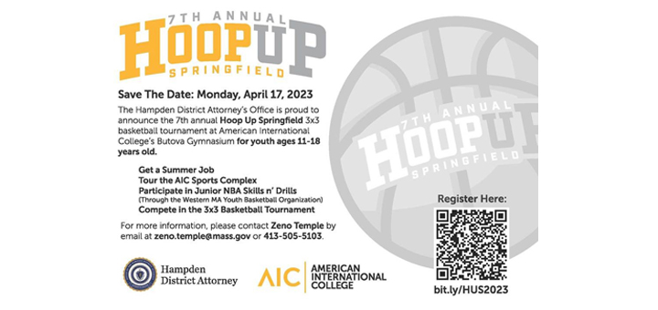 April 3, 2022 -Springfield- Hampden District Attorney Anthony D. Gulluni’s youth summer job fair and 3-on-3 basketball tournament – Hoop Up Springfield – returns on Monday, April 17, 2023 at American International College. The daylong event will offer a fun and safe environment for about 100 pre-registered youth, from ages 11-18, to enjoy an organized basketball tournament, but also to learn about summer employment opportunities and to interact and apply directly with employers.
