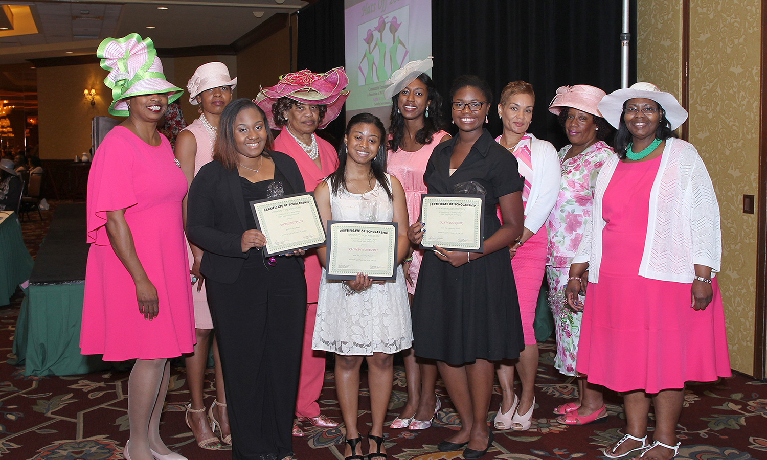 AKA Book award scholarship recipients from L to R: Savannah Taylor, Kalimah Muhammed and Erin Washington. Sorority committee members Rhonda Brace, A. Clarissa Wright, Sandra Falconer, Ashley Sherrell, Nicole Carmichael-Keel, Denise Cruse and Nicole Brooks at the 2016 AKA Sorority “Hats Off”.