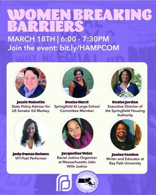 Join The Hampden County Commission on the Status of Women and Girls on Thursday, March 18th for a dynamic Women’s History Month event, “Women Breaking Barriers” featuring powerful women from across Hampden County! This event, moderated by Commissioner Shanique Spalding, who is also an Organizer for Planned Parenthood Advocacy Fund of Mass, features Women of color who have smashed through barriers to achieve success in their industries against all odds. We look forward to seeing you at this dynamic event!
